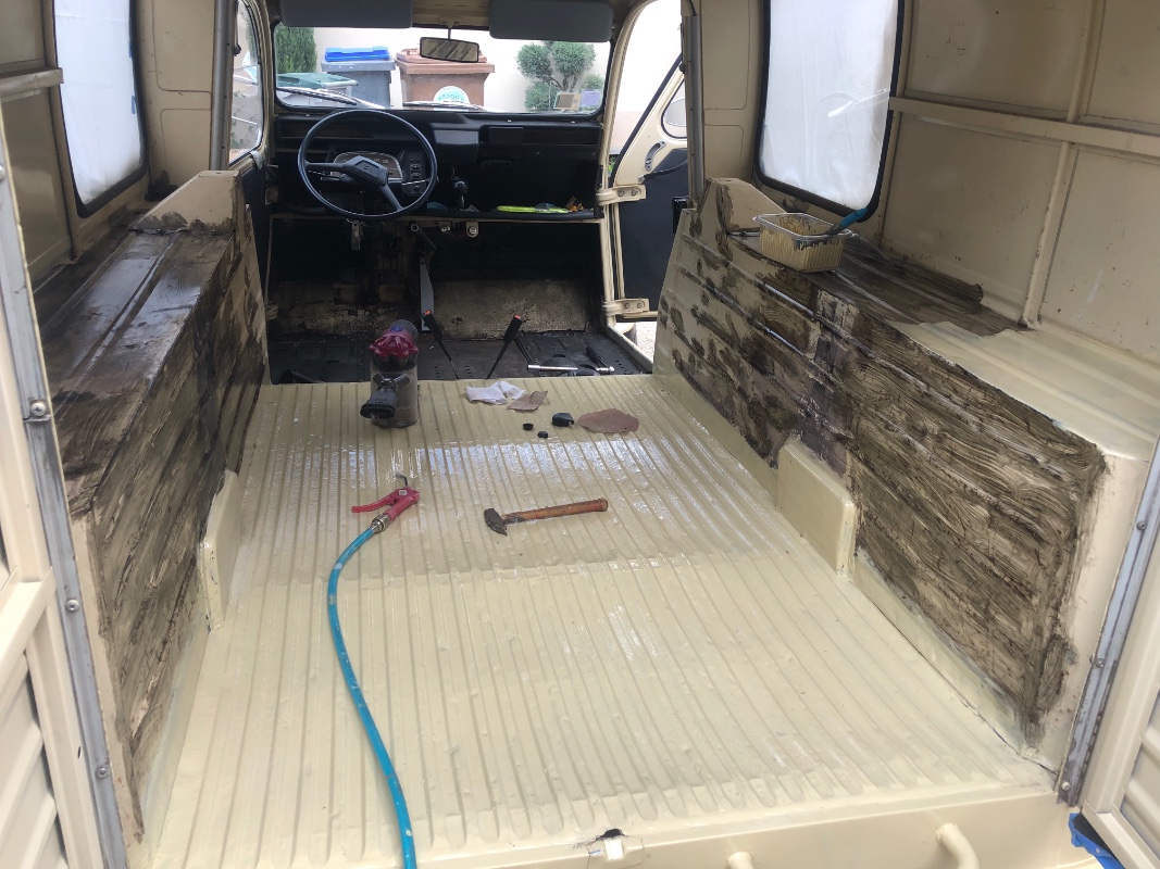 J’ai déjà fait tout un travail de carrosserie et de peinture (elle est de couleur beige gazel avec des accents gris diane), ajouté des ceintures 3 points, restauré les sieges, restauré les jantes en les peignant blanches. Je suis entrain d’adapter des feux led (de jeep