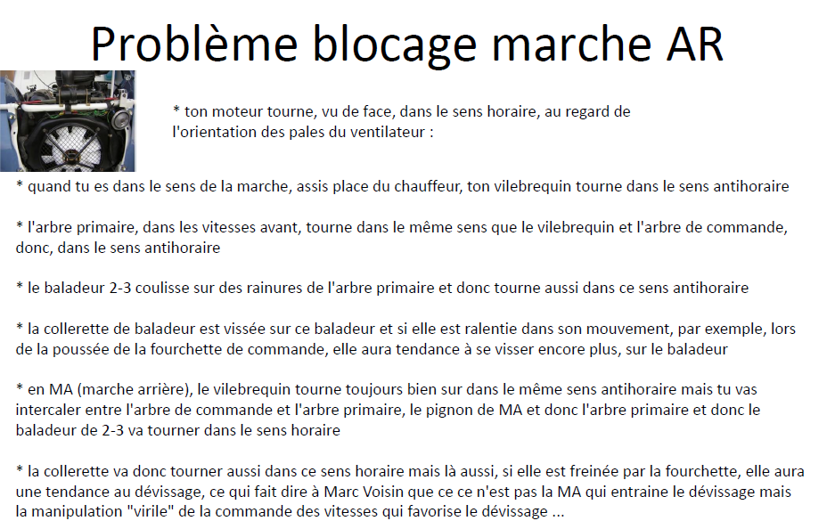 Ce que tu montres, n'est pas le baladeur de 2/3ème mais le baladeur de 1ère/MA . Le baladeur de 2/3ème peut avoir été dévissé lors d'une marche arrière brutale, ce qui bloque la boite de vitesse. Pour y remédier il faut démonter l'arbre primaire, donc sortir les axes etc...en prenant bien soin de repérer l'emplacement des 3 fourchettes surtout. Ensuite il convient de donner quelques coups de pointeau sur le pourtour du baladeur de 2/3ème comme montré ci dessous : et l'explication : Avec ça tu peut t'en sortir si tu as la boite bloquée bien sûr, si ce n'est pas le cas alors va voir du côté des synchros . Par contre eux, ne se revissent pas . S'ils sont usés, il faut les remplacer. Il doit exister un tuto sur le forum expliquant comment procéder...pour un BV de Deudeuche, mais je pense que ce doit être la même technique pour une BV d'Ami 8...