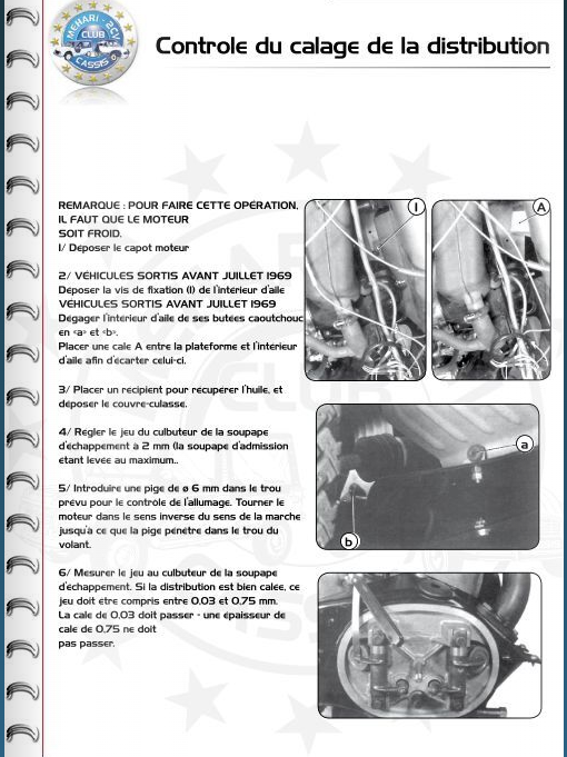 Je fais référence au contrôle de calage de la distribution ( là, j'ai comme support l'Expert auto de la LN) Soupapes réglées 2 mm sur le cylindre droit on cherche en tournant de gauche à droite (contraire au sens de marche) le PMH compression , l'autre cylindre ayant les soupapes en bascule . Une fois le PMH trouvé on pige. La soupape d'échappement du cylindre en question doit selon le RTA présenter un jeu de 0.03 à 0.075 mm cette mesure permet de confirmer le bon calage de la distribution.