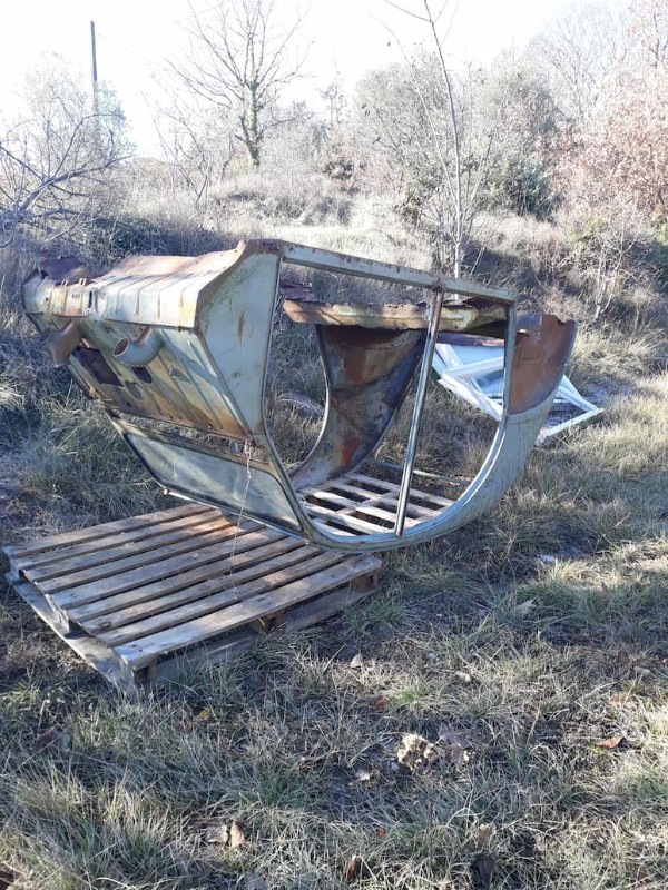 En fait, dans ma fougue, j'ai récupéré un chassis roulant en bon état sur lequel il manque tout: les batteurs, les pare-chocs, le support de commande frein-embrayage, bien sûr les plaques d'identification et toutes les canalisations de frein. Bon mais y avait dessus une caisse assez abîmée des planchers mais, au vu de ce que j'avais déjà consulté sur d'autre rénovations, il n'y a pas péril en la demeure. Il y avait aussi 2 capots pas trop vilains, toutes les portes en double, 2 couvercles de malle, les ailes avant en double, une seule aile arrière, une capote en état correct, des vitres, le pare-brise, pas de sièges et deux-trois boites de quincaillerie.