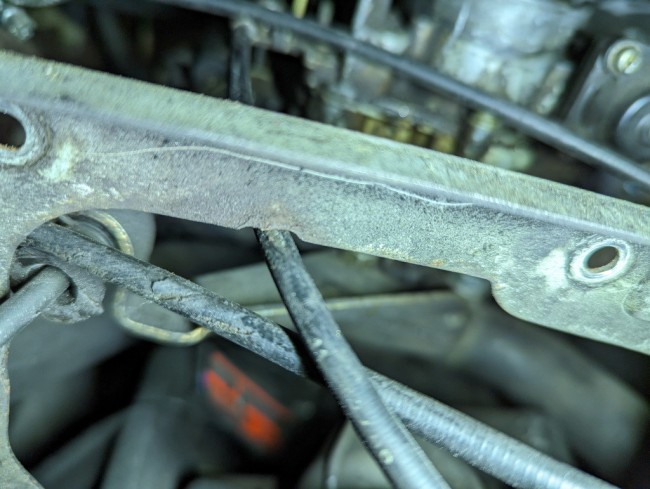 J'ai raclé ce qui a bien voulu se laisser attraper, et j'ai aussi utilisé du dégraissant que j'ai proprement retiré avec la crasse qu'il a pu détacher. Avant de remonter la boîte nettoyée, j'observe un combat entre la gaine du câble du starter et le support de la boîte : Un bout de 5 cm de tuyau souple est coupé sur sa longueur, inséré sur la gaîne et immobilisé avec des colliers.