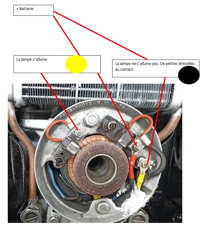 PS 2 : et puis si tu as un fil coupé sur ta voiture ou une connexion oxydée, tu vas chez ton électricien qui va valider le bon fonctionnement de ton régulateur et de ta dynamo. Et remontés, sur ta 2cv, cela ne marche pas ...