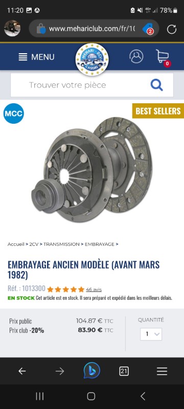 C'est une 2CV6 Special de 80, mais je pense que le moteur a ete change. A quoi dois-je faire attention pour commander les bonnes pieces? L'embrayage lui-meme semble fontionner, donc butee seule? Ou tant qu'a faire embrayage complet? Meme si en y pensant, ca "gratte" un peu de temps en temps en changeant les vitesses, du moins a l'arret.