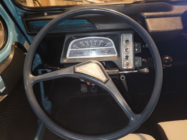J'étais embêté, car mon commodo de clignotants ne faisait pas de bruits, ni ma centrale, je ne savais pas quand mes clignotants étaient en marche, donc j'ai mis un commodo avec bruiteur intégré et j'ai bidouillé un système pour avoir un rappel visuel vu dans un 2cv Xpert. Cela explique la petite loupiote au dessus du commodo.