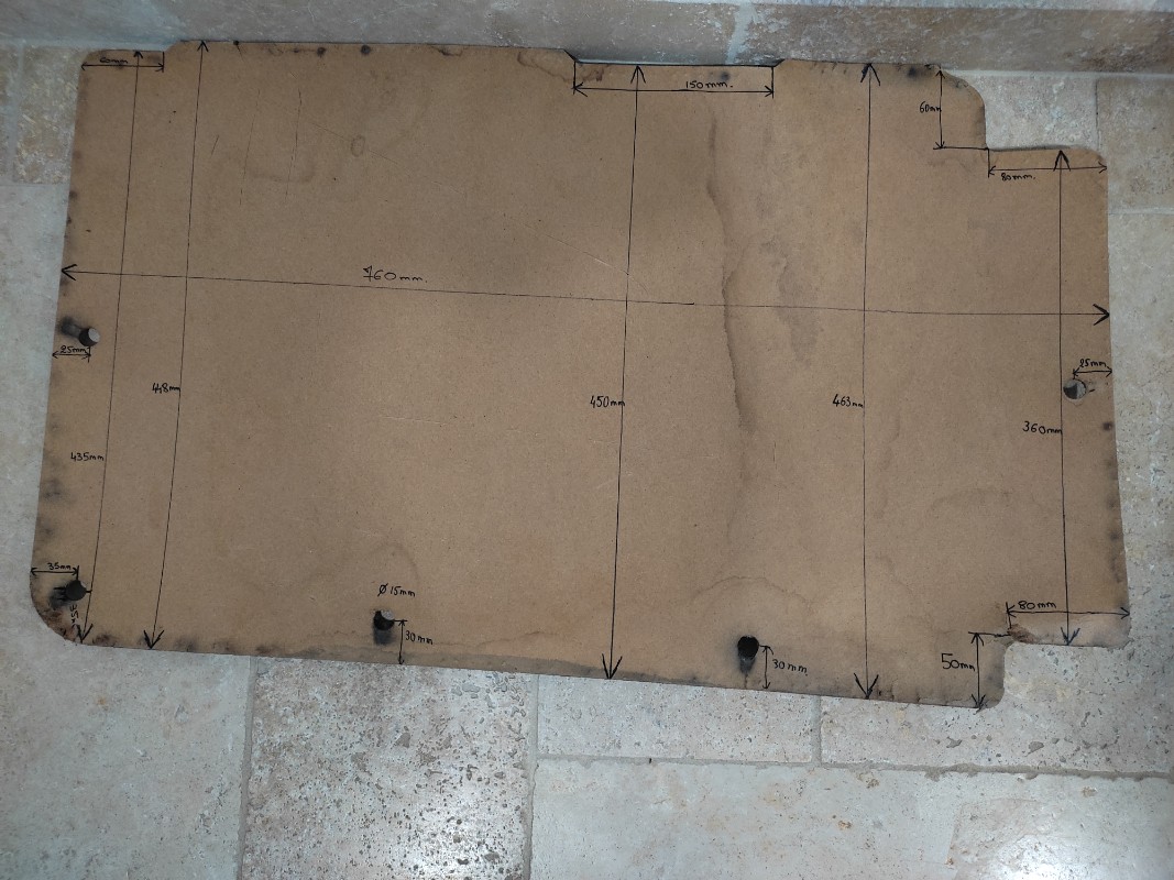 Le mieux est de se servir des anciens comme gabarit de traçage, je t'ai mis les dimensions ci-dessous, attention le panneau n'est pas d'équerre dans sa partie basse, ça se voit sur la photo, il est légèrement plus grand côté des découpes pour les charnières, je ne l'avais jamais remarqué. Eric