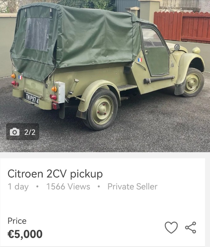 Vue aujourd'hui sur Donedeal, le "Bon Coin" irlandais, cette 2cv présentée comme étant "one of a kind" ("unique en son genre" pour les non-anglicistes)!