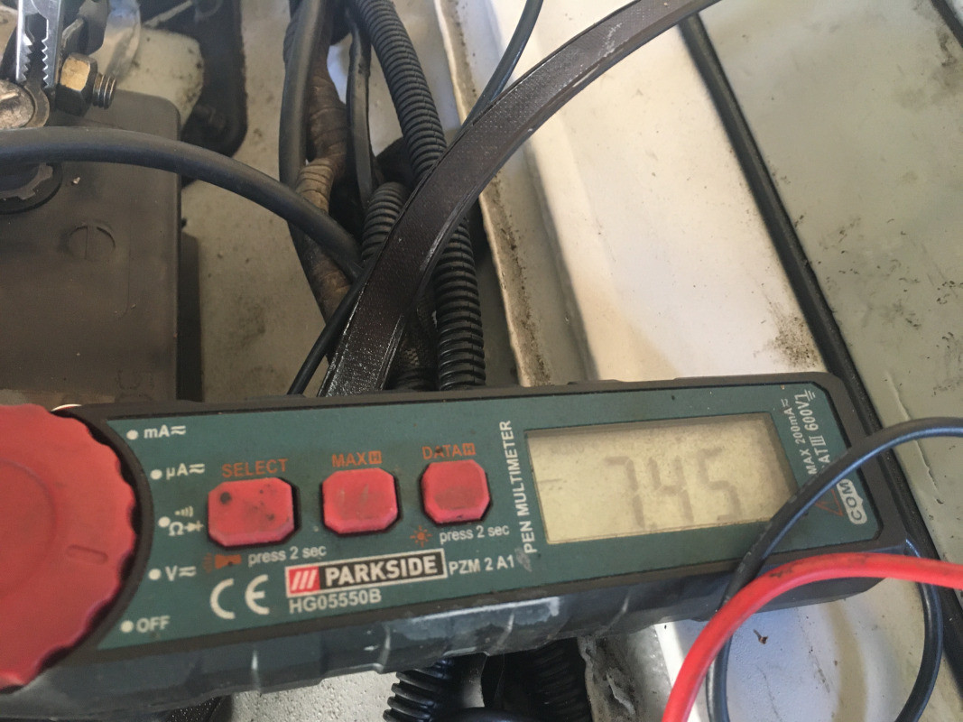 Au ralenti 7,45V A mi-régime 7,7V (c'est mieux) : En revenant au ralenti, la tension retombe à 7V : Je considère ces valeurs comme encore élevées, la tension de la batterie est déjà à 6,5V : Bref, je considère donc que la dynamo DUCELLIER a un problème.. J'ignore lequel, je ne comprends même pas comment une dynamo, normalement excitée, peut "monter en tension" seule..