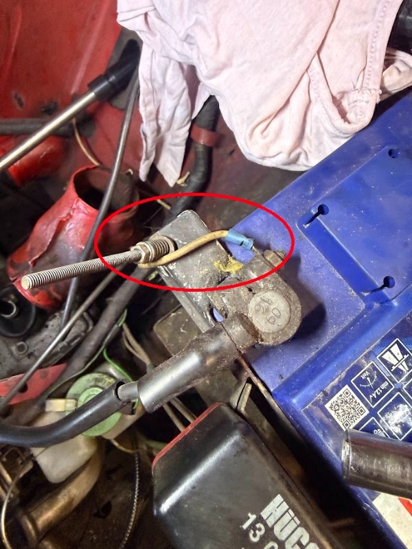 Je remarque alors, dans l’habitacle côté passager, la cosse d’un fil déconnecté. J’essaie de la rebrancher : énorme étincelle (contact coupé, bien évidemment). Je retente, et là le fil brûle carrément. Bon, plus de peur que de mal… Je me dis que je ne vais pas pouvoir repartir, et au final ça n’a eu aucune incidence : j’ai réussi à ramener la voiture chez moi.
