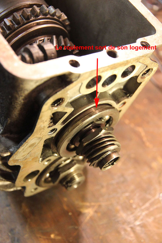 après avoir remonté l'arbre primaire et repositionné : et après avoir fait tourner l'arbe moteur : tout a bougé : le roulement sort du logement : j'imagine que "quelque chose" doit empécher cet arbre de bouger ainsi latéralement...