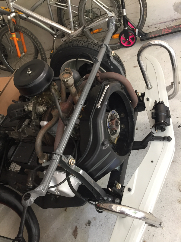 Les vacances sont finies. (Depuis un moment déjà). Il est temps de reprendre le remontage de la 2cv. Donc on s'y remet. Je fait prendre l air au châssis qui va se promener pour souder les rallonges latérales et qui reviendra avec la coque boulonnée.