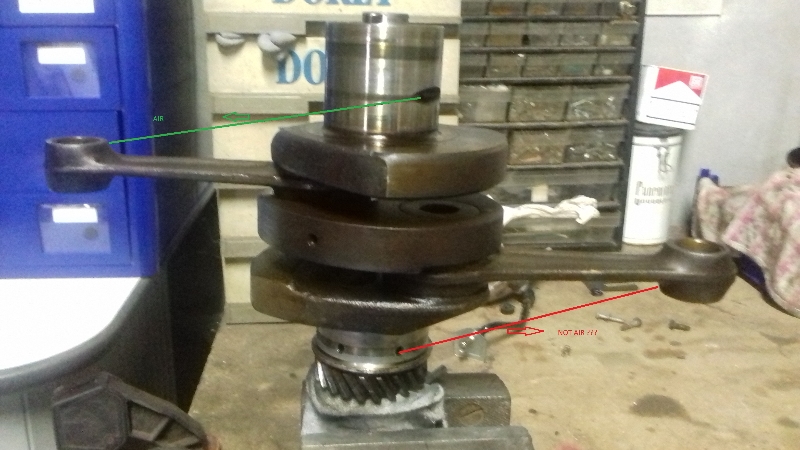 Est-ce que lorsque tu envoies de l'air dans les trous des bagues sur le vilebrequin, là où tu as mis un trait bleu et un trait rouge sur ta photo, il n'y a pas d'air qui sort aux pieds de bielles, aux extrémités des deux traits en question ?