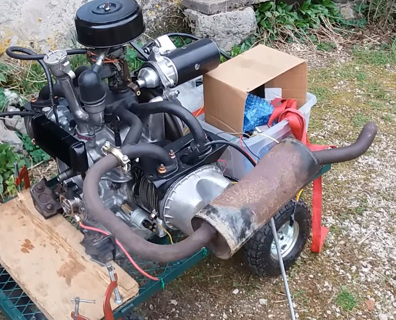 La bonne idée de la veille , faire 200 km pour acheter un autre moteur sur le coin coin (qui avait essayé d’être monté sur un mini tracteur) et qui avait une cloche de boite scié pour tenir le démarreur et un pseudo faisceau ( qui était complétement naze) .