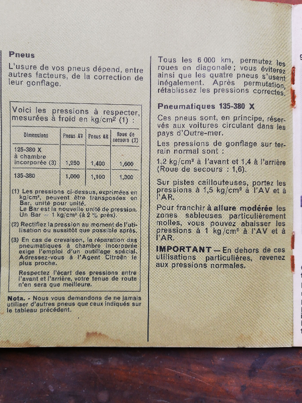 Pour les pressions, c'est un tableau établi à partir de données de différentes RTA et de sites. Merci de corriger s'il y a des erreurs, et il y en a certainement. Les valeurs sont peut-être différentes dans les documents de bord des 2 CV.