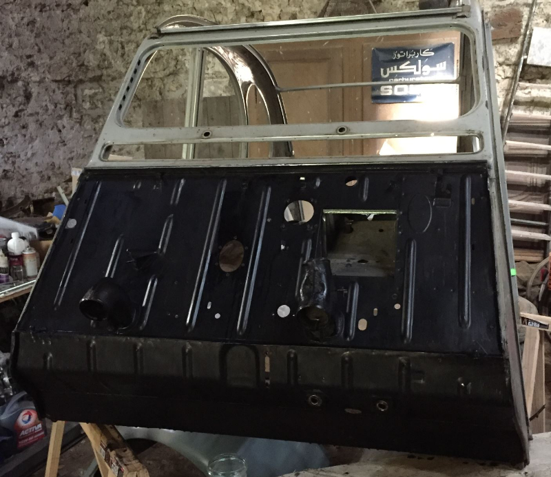 La caisse est (presque) du bon modèle, sauf cette histoire de pédalier, comme si le tablier avait été changé. Il faudra refaire les trous pour les pédales de frein et embrayage, boucher le trou du maître cylindre, et mettre le bon pédalier (se trouve en bourse). Remplacer les feux arrière carrés.