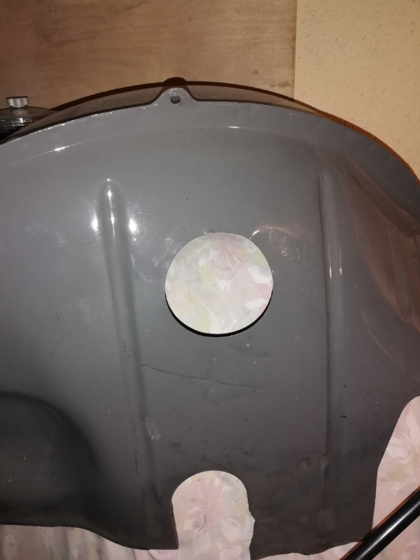 Je suis entrain de fermer le trou d'aile : Deux ronds de fer en 8/10 de 120 mm et un joint de 110 mm provenant d'un bocal de conserve en verre collé sur une face, il passe pile dans le trou de l'aile...