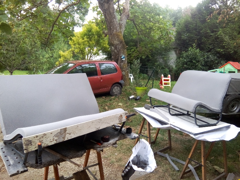 Le sellier a tout repris, même le tissu acheté je ne sais plus à quel revendeur n'était pas tout à fait aux bonnes cotes ( normal, ils ont l'habitude de nous vendre de la daube )...bref pour rigidifier l'assise, il a cousu une mousse dense sur le tissu en reprenant chaque couture du tissu pour ne pas voir le rajout de la mousse : un travail de dingue ! le résultat est que j'ai des assises parfaites qui n'ont pas besoin de coussins ! le prix : 450 euros de main d'oeuvre les deux banquettes qui me reviennent environ à 700 euros...