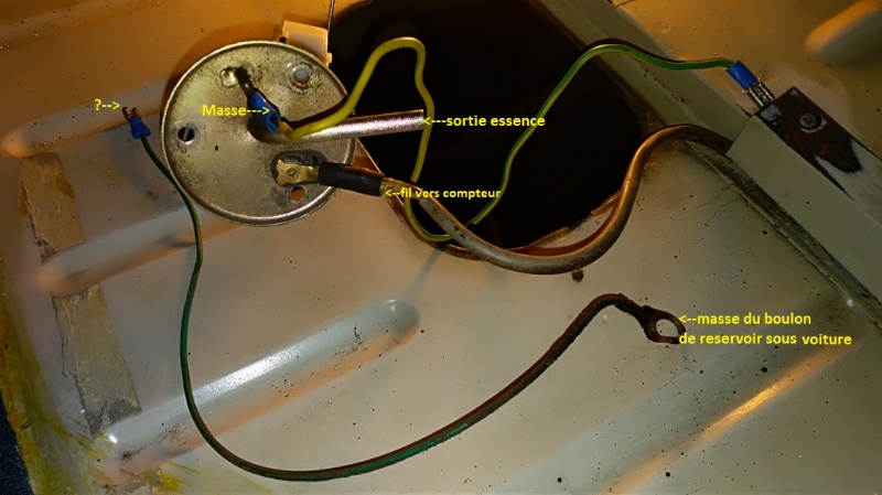 autre question, en retirant le boulon ou se trouve la masse sous le reservoir, le fil est tombé par terre, et je ne sais pas ou se relie l'un des cotés de ce fil… :laughing: donc je joins une photo qui montre ma jauge et ses connexions existantes et j'ai mis à coté de la jauge le fil de masse qui était sous le reservoir, donc merci de me dire ou se branche cette connexion avec le " point d'interrogation "?"....
