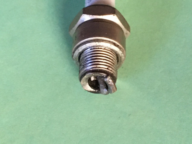 On vérifie l'allumage, normal, on remet en route, toujours trois pattes. C'est le troisième cylindre qui flemmarde :shock: On démonte la bougie pour voir s'il y a une étincelle. Et là, surprise, la bougie est toute fondue, crois t-on, ou plutôt elle est écrasée.
