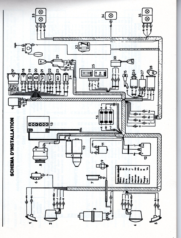 Voici un schéma d'installation de 2 CV 6. La jauge est en 31 et le plafonnier en 32.
