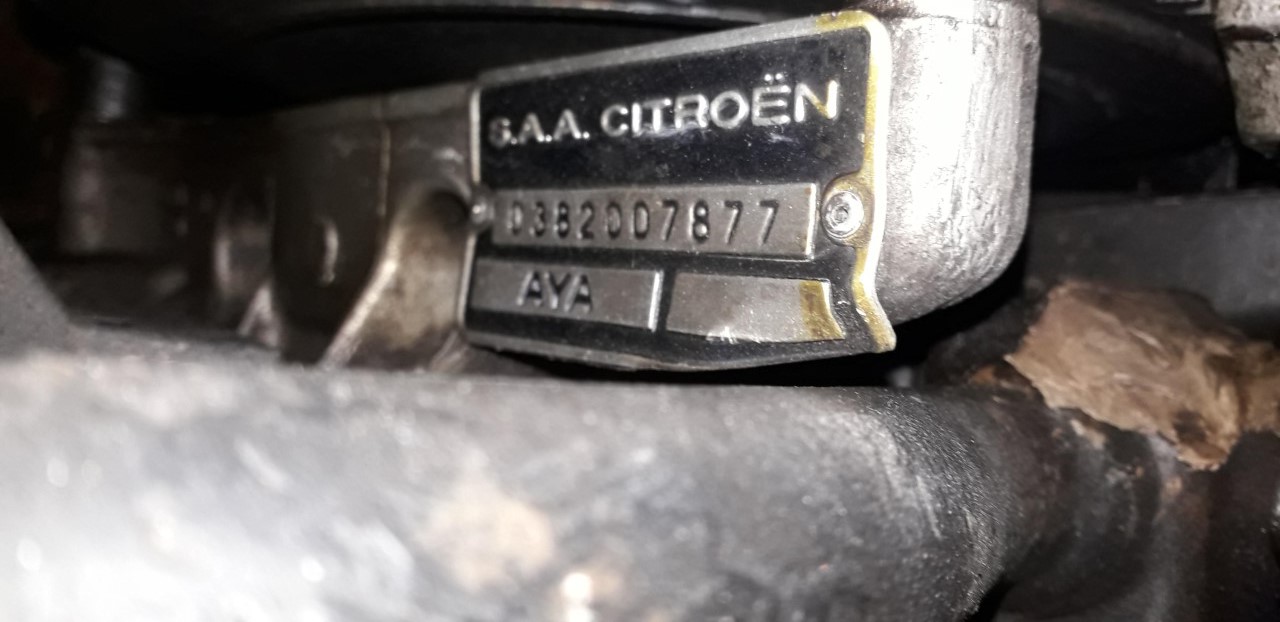 Plaque moteur : AYA, c'est le moteur des premières Dyane. Il ressemble beaucoup à celui des AZAM, mais en principe il est équipé d'un carbu de 34 au lieu du 28, ce qui lui donne 24 ch. Ceci dit on peut lui monter la pipe des AZAM avec carbu de 28.