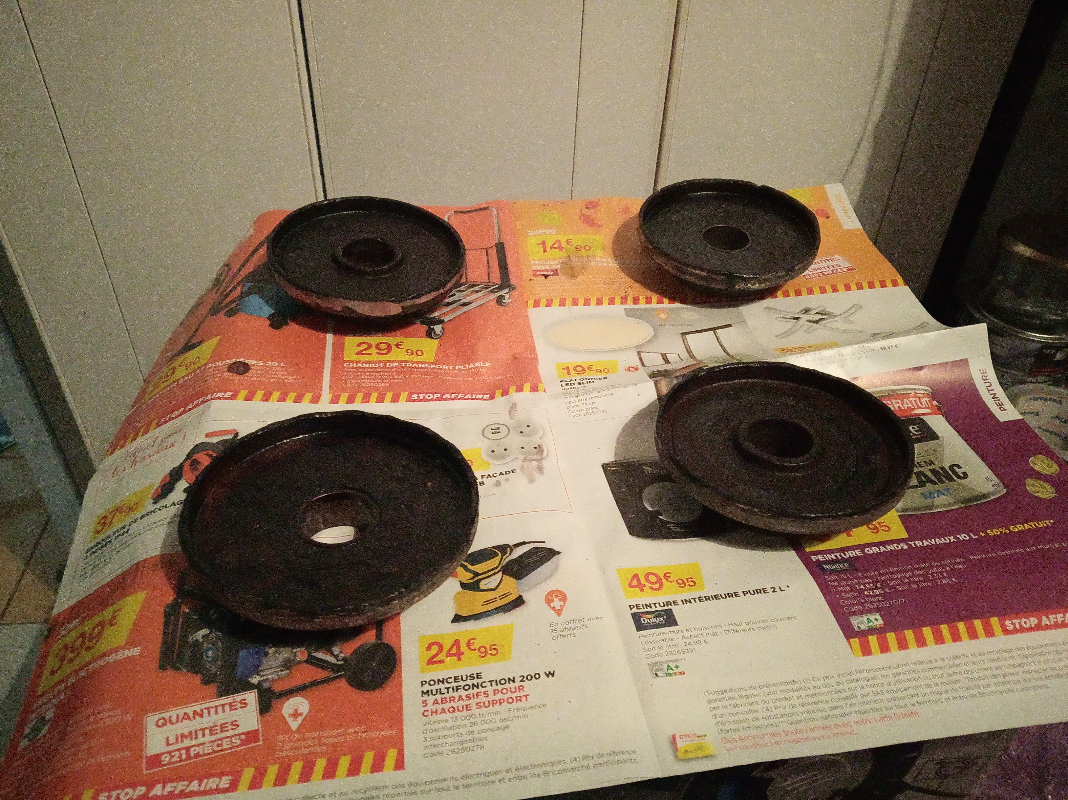 pour l'instant j'ai juste mis un coup de férose sur les 4 embouts qui étaient quand même encore assez rouillés après brossage, donc avant l'hamerite, je préfère en rajouter une couche ! la chimie fera sont travail. je les ai mis dans ma chaufferie ils passeront la nuit au chaud. :lunettes: