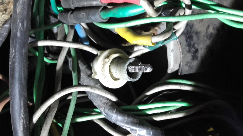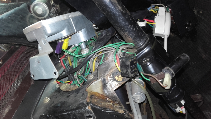 Deux paires de fils et cosses nikels, qui sortent d'une fin fond du trou de derrière le tableau de bord.