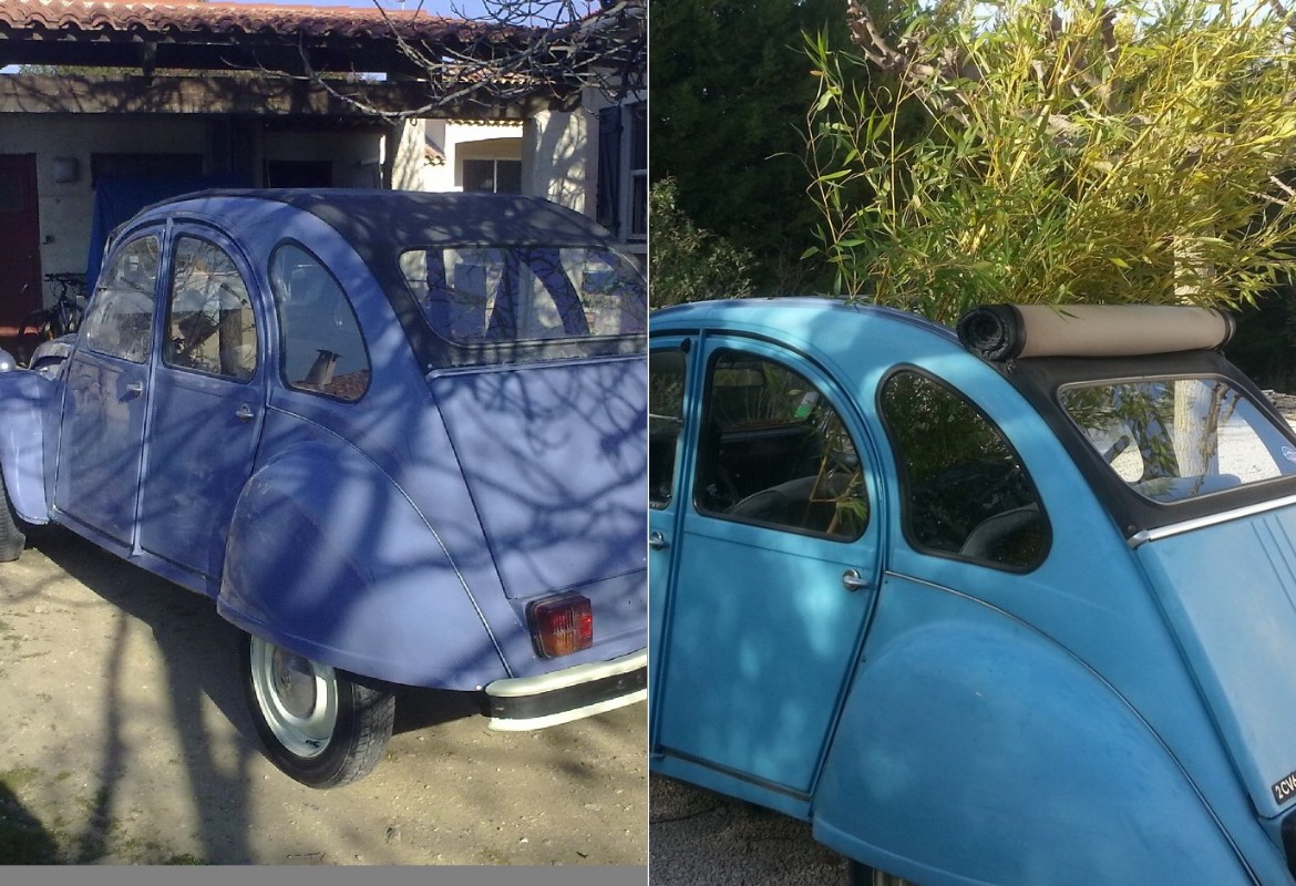 Au début, ma deuche avait vraiment la teinte bleu céleste, mais au fur et à meure des années, elle a passé, bouffée par les UV, car le peinturlurateur à du "oublié" de mettre un ingrédient dans son mélange.