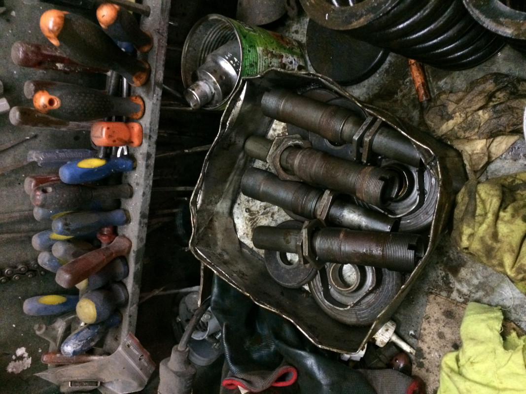 bon , pour continuer la rénovation :pour remonter le châssis j'ai été obliger de rénover les pots de suspensions . en effet sur les 2 il y avait 1 tirant sectionner (je pense par la rouille !!).