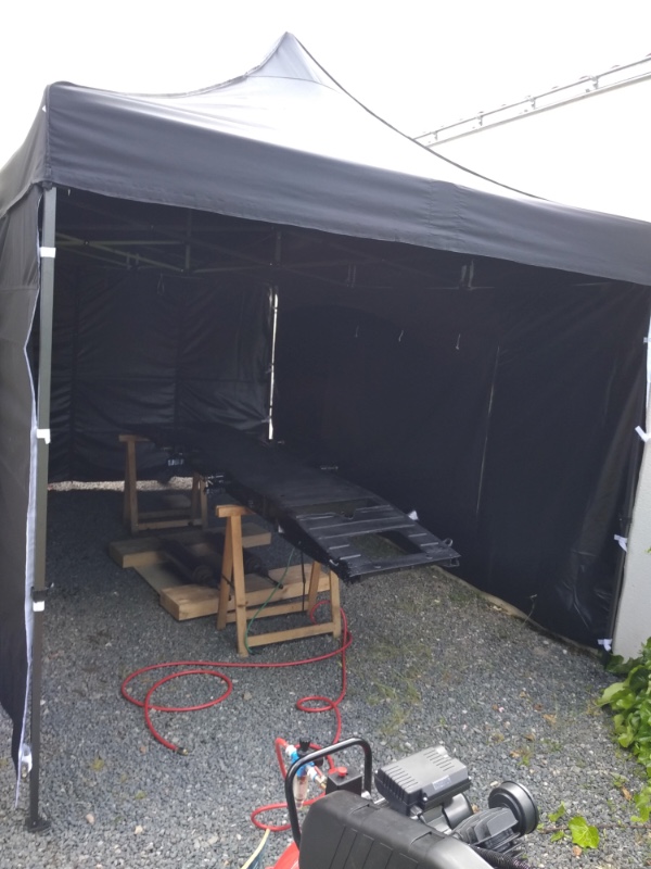 Seul endroit pour peindre les trois mètres qui séparent les deux pans de mur , une toile de tente pile poil de 3 mètres sur 4,50 m , avec mur ( pour protéger des possibles projections de Blackmon)démontage en 20 mn.