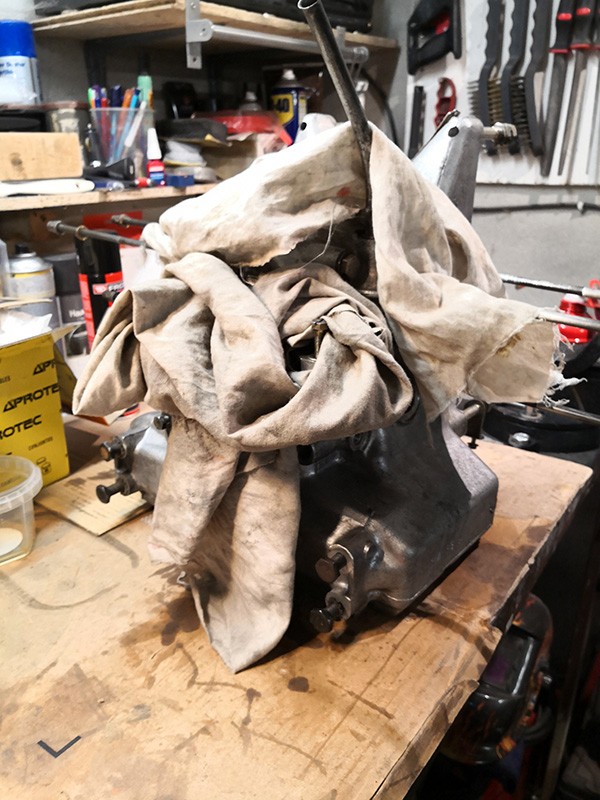 Une petite photo de mon moteur mis sur mon étaux à l'aide d'une pièce métallique fixé sur les support moteur. Je redégraisse mes carters une dernière fois.