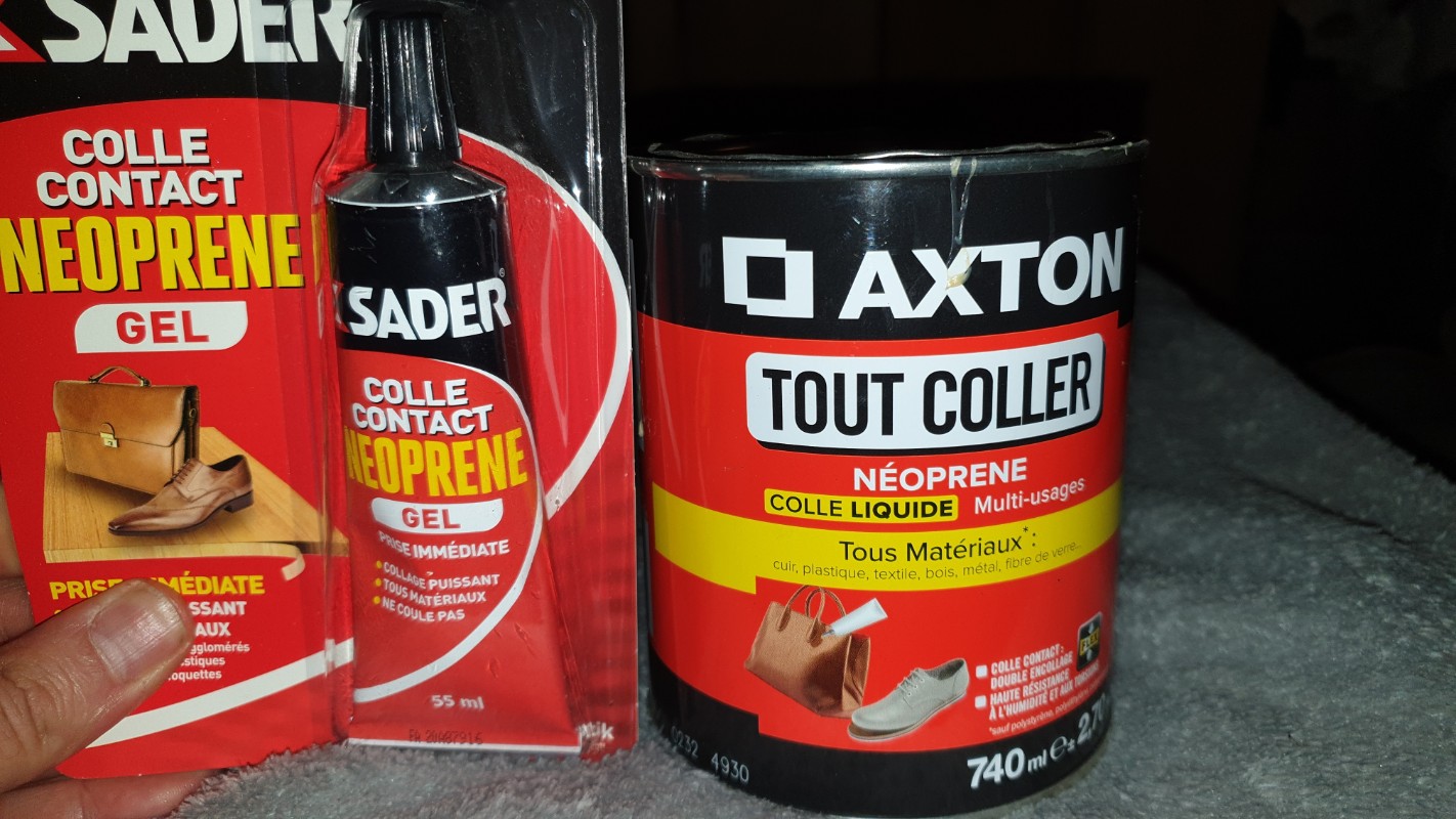 De mon côté, j'ai acheté de la colle en tube Patex en Néoprène (Contact Tic-Gel) de chez Act*on