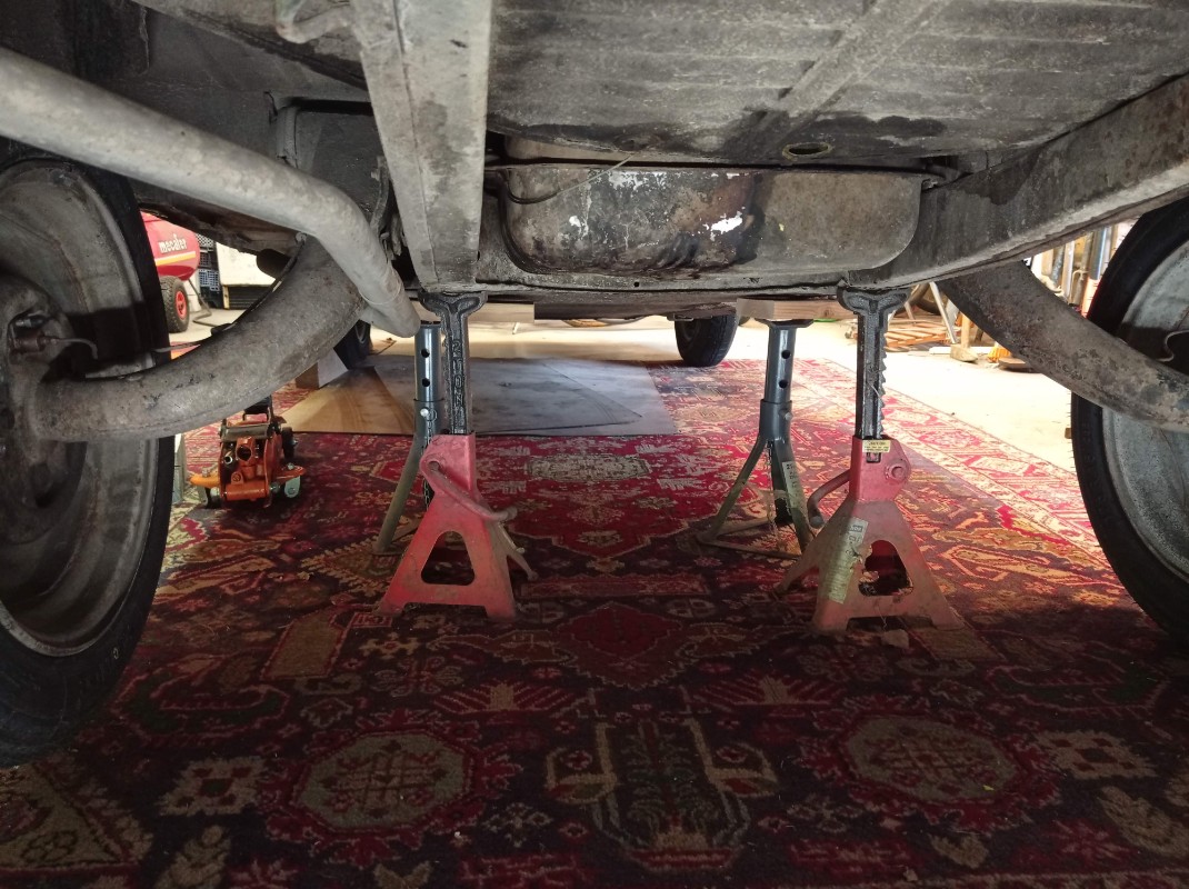 Le mieux serait d'avoir un pont élévateur. Sinon, lever l'arrière de la 2 CV et la faire reposer sur deux chandelles solides.