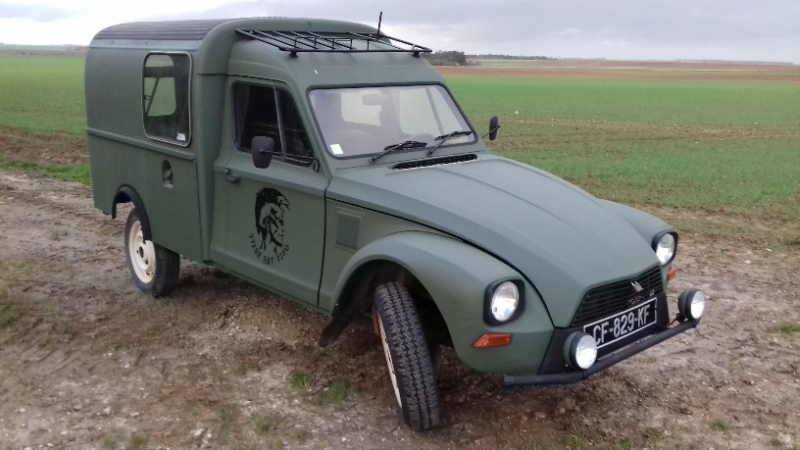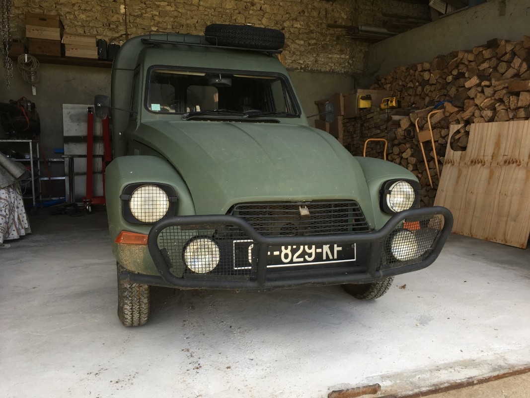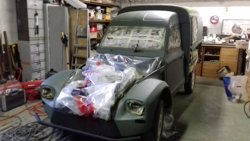 Démontage du superflus, ponçage ,masquage des vitres et peinture à la bombe mat . Cette Acadiane est destinée aux tous chemins donc pas besoin d'une belle peinture même si je suis content du résultat (auto satisfaction) :laughing: