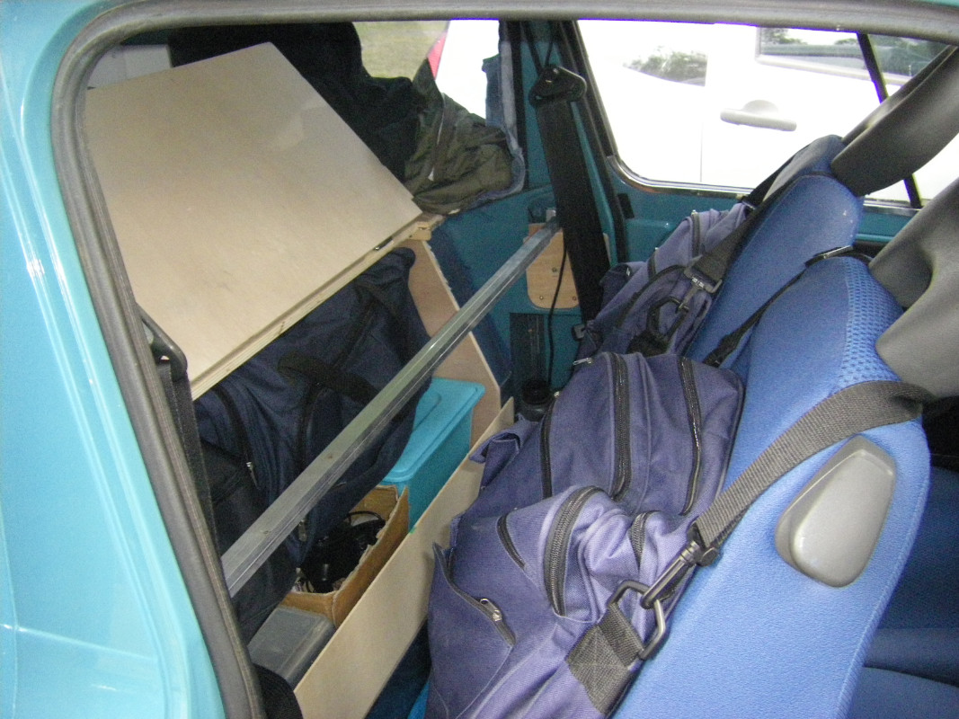 Pour le lit, un panneau d'aggloméré ou de contreplaqué monté sur des coffres, et pour l'allonger un peu vers l'avant, une extension fixée avec des charnières et qui se rabat sur le haut des sièges avant, qui eux se plient légèrement vers l'avant. Avec ces aménagements le lit fait deux mètres.