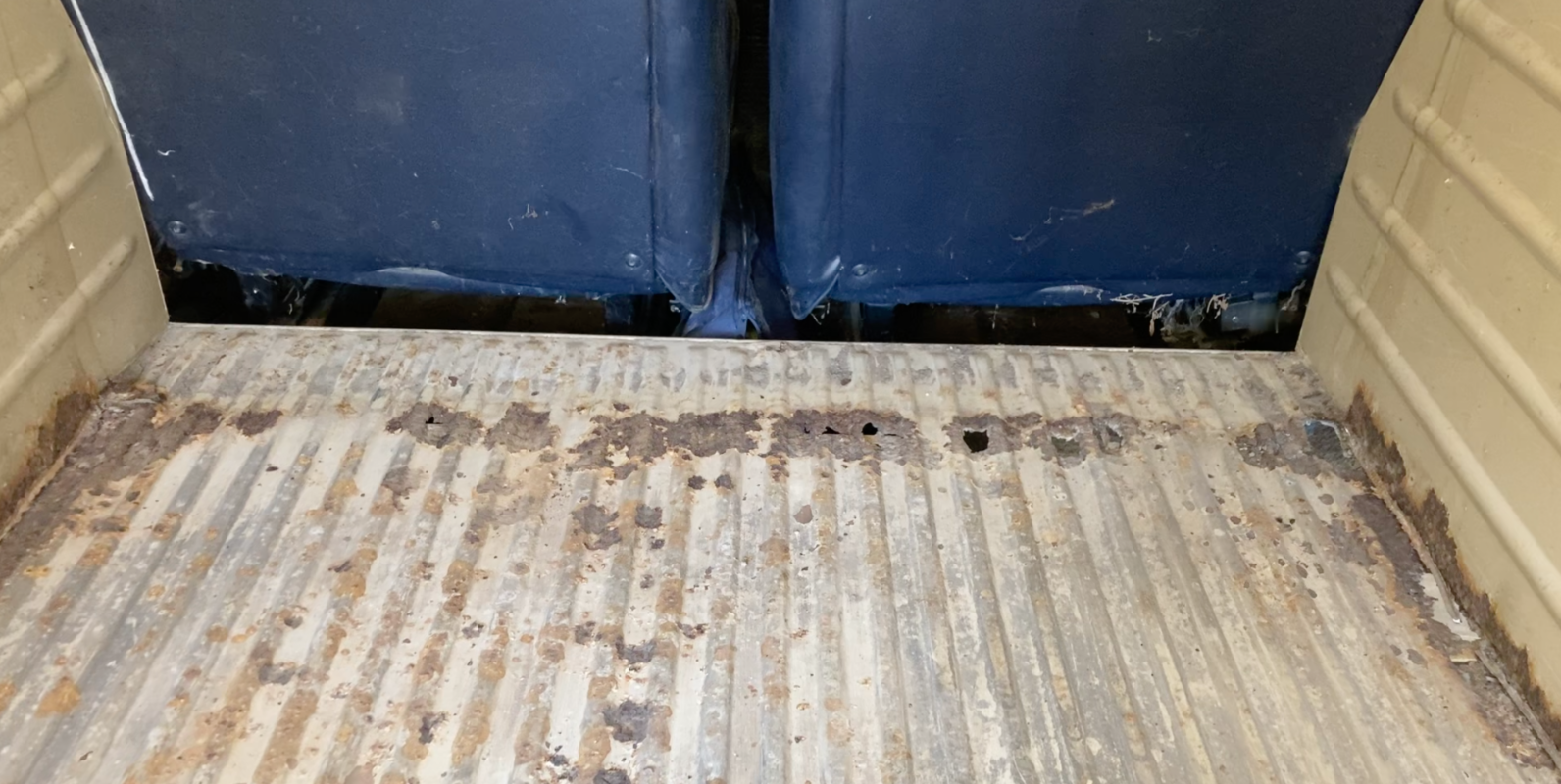 Le premier propriétaire de mon AK 400 avait, dès livraison de sa voiture, posé un habillage en contreplaqué pour protéger tout l’arrière. Je viens de démonter tout ça. Et, mauvaise surprise, il y a de la tôle rouillée et des trous dans le plancher.