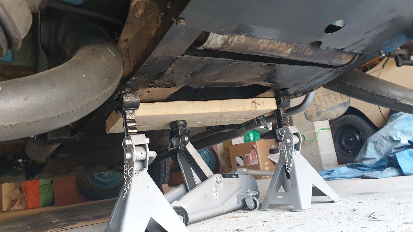 Puis avec un vérin hydraulique, j'ai soulevé le bloc moteur-boîte et là, sa passe.