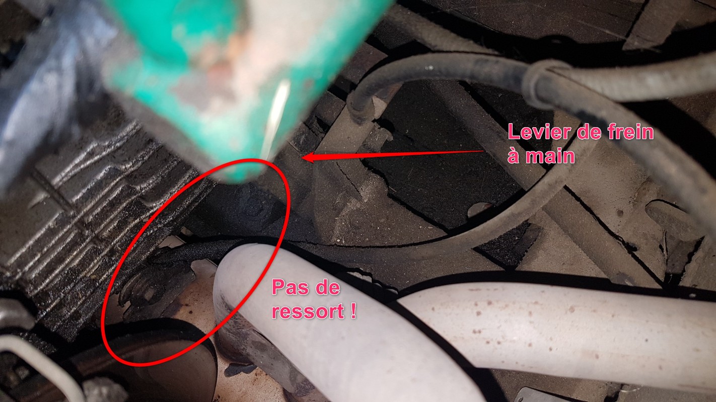 Je viens d'aller voir sous le capot .... Je n'ai pas de ressort fixé au levier de frein à main. Ni sous le capot, ni dans l'habitacle !