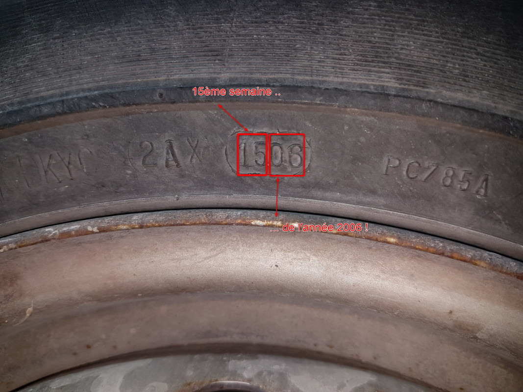 Mais lors d'un contrôle technique, la date de fabrication du pneu doit être OBLIGATOIREMENT lisible sur le pneu (voir photo plus loin !),sinon c'est contre visite !