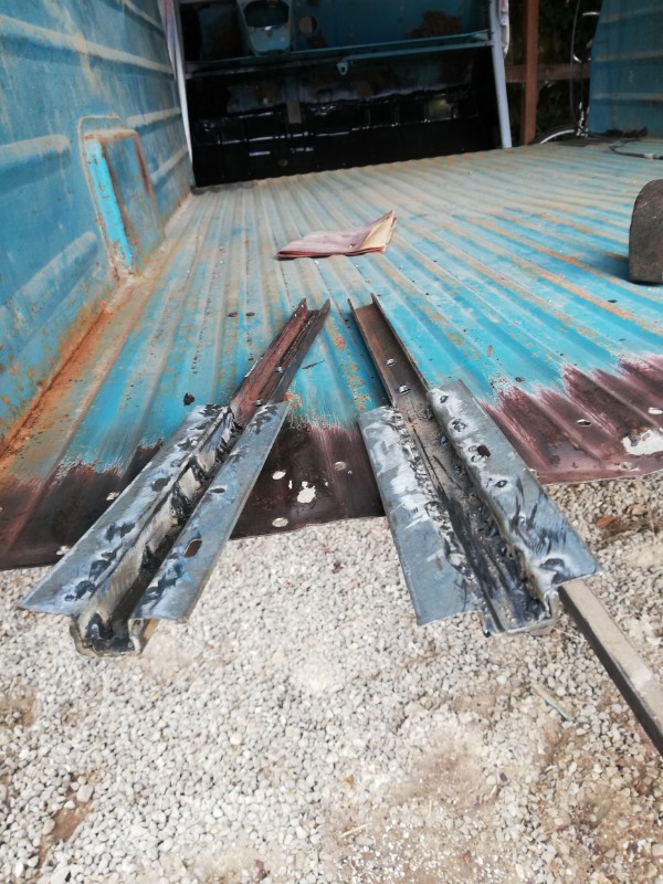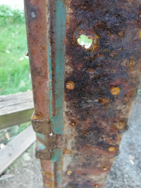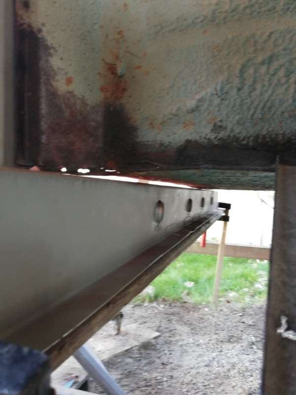 Voyez vous même : le bossage de l'ancienne jupe est très fin et à 1,5 cm du bord, celui de la neuve est bien plus large à 2,5 cms du bord : du coup le plancher se retrouve carrément sur le bossage et c'est pas top ! Sur l'ancienne jupe, la limite peinture/rouille correspond à l'emplacement du plancher ; on voit bien une différence de positionnement...