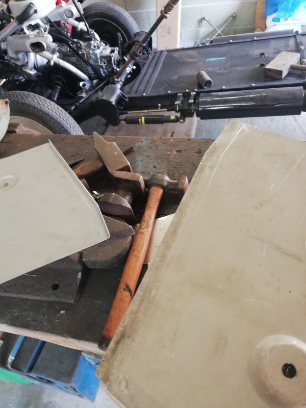 Après avoir supprimé le bossage de la jupe je l'ai remontée à blanc et là ça va beaucoup mieux : Après quelques réglages de hauteur la jupe est bien placée : En suivant je me suis penché sur les deux tôles latérales et en mesurant précisément j'ai vu que j'avais 1 cm de trop : donc traçage , puis mettre à plat le retour fait d'origine, tracer au burin et marteau la nouvelle ligne de pliage, puis pliage final à la bonne cote...Tous ça, sans problème d'ajustage par la suite OUF !!!