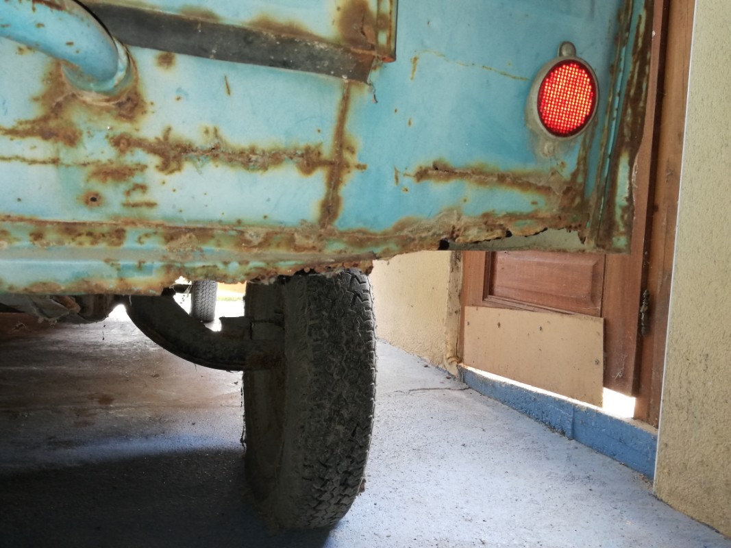 La caisse étant terminée sur le plan soudure , je m'attaque aux éléments amovibles et pour commencer par la trappe de la roue de secours qui est bien attaquée par la rouille au niveau du profil de rigidification :