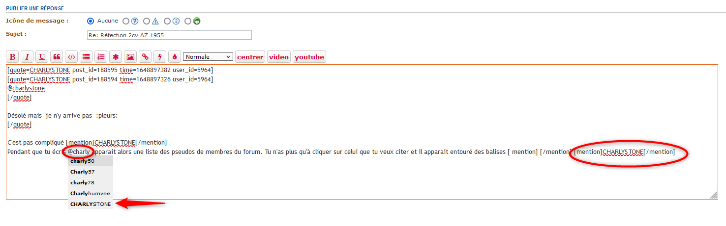 Pendant que tu écris @charly, apparait alors une liste des pseudos de membres du forum correspondant. Tu n'as plus qu'à cliquer sur celui que tu veux citer et il apparait entouré des balises [ mention] [/mention] @CHARLYSTONE