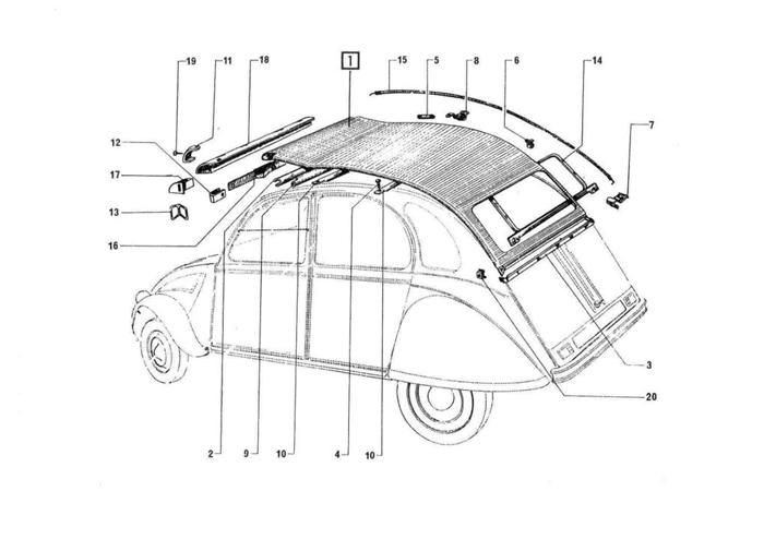 La mienne est encore bien, seulement 2 petits accros et la toile est restée souple et a gardé sa couleur d'origine. Par contre la colle et les caoutchoucs n'ont pas résistés avec le temps. Pour la colle, ça devrait aller. Par contre, je cherche les bourrelets qui sont identifiés par la référence 15 du schéma ci-joint. Je ne trouve ça nul part. Auriez-vous une suggestion ?