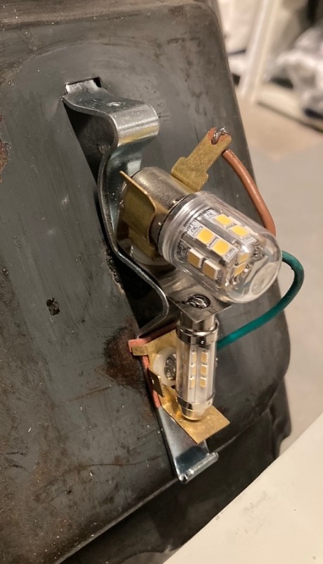 Pour le raccordement, j'avais au début une ampoule avec deux culots : Un pour le filament du clignotant et l'autre pour le filament des feux de position. Sur la nouvelle ampoule, un seul plot, j'ai juste mis les deux fils ensemble et ça fonctionne très bien : l'ampoule s'allume par le clignotant et par l'interrupteur des feux de position.