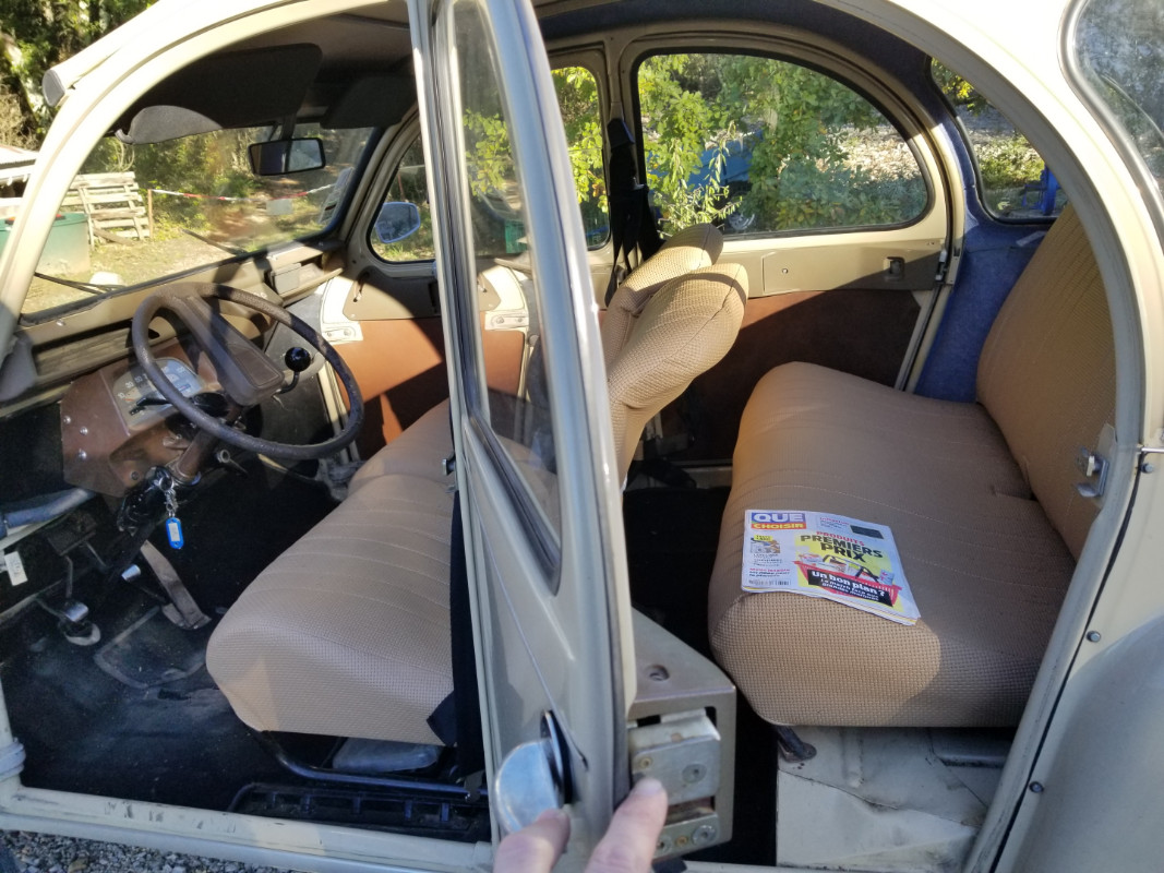 J'envisage de demander le certificat FFVE pour immatriculation collection bien que j'ai des doutes sur certains points (notamment, j'ai des phares ronds au lieu des phares carrés d'origine, le revêtement de tôle intérieur en carton gris a été changé en moquette bleue, les sièges ont été refaits à neuf même couleur mais en sky au lieu de tissus, elle a des freins à tambours de grand diamètre au lieu de petit diamètre, boitier de filtre à air en plastique au lieu de métal, allumage électronique, pare-soleils neufs...). A part ces détails, elle ressemble fort à l'originale. Le texte de loi interdit bien les "modifications notables" mais sans préciser que ce veut dire "notable"...
