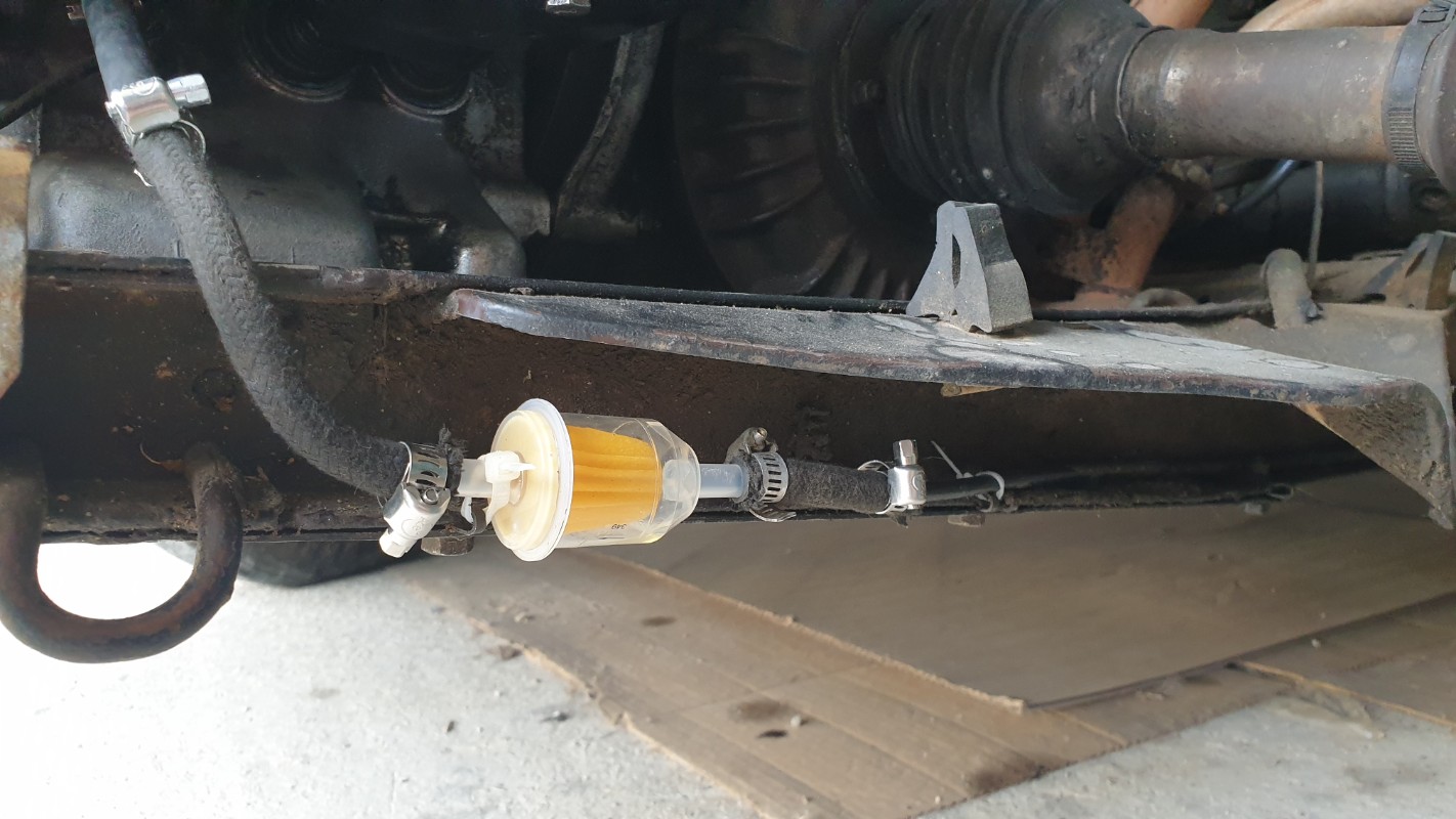 Bon, ton filtre a essence doit être placé avant la pompe à essence pour qu'il puisse la protéger. L'emplacement se trouve le long du châssis en regard de la roue gauche. Je reste un peu circonspect sur ta boîte à air, il me semble que tu devrais avoir ce modèle Après c'est bien un 435cm3, les boîte à chauffage spécifique montées en "parallèle", l'alternateur et certainement l'absence de filtre à huile.