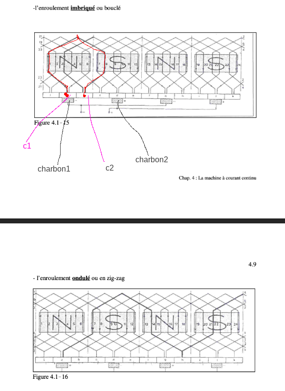 On voit bien que le charbon lors du passage des contacts de bobines mets une bobine en court-circuit, je comprends aussi que 4 bobines sont en série lors de l'exploitation du courant, ce qui en reste plus que 3 momentanément.