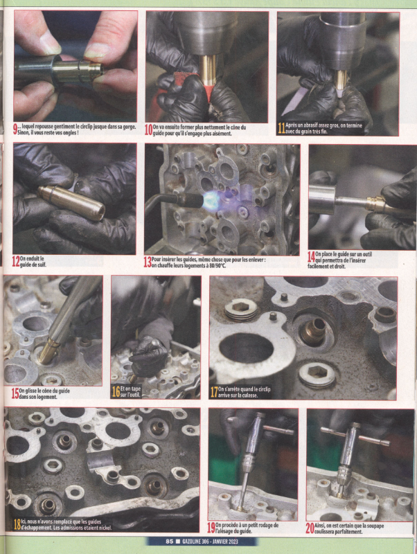 Je pense que je serai capable de remplacer les deux guides de la culasse, encore faut il les trouver, puis disposer des outils adéquats pour la pose et le réalésage, outils que je n'ai pas...Ensuite il faudra passer un léger coup d'alésoir sur les sièges, rôder les soupapes...alors quitte à emmener la culasse chez le pro, autant qu'il fasse tout les travaux de rénovation... guides , sièges, soupapes.