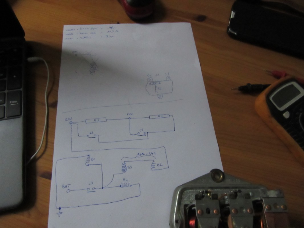 13/ chapitre 14-1. ne pouvant pas débrancher les deux cosses de l'inducteur, j'ai procédé un peu différemment je suis arrivé à la prise de résistance de 2.6ohms, conseillé entre 3 et 5 ohms, différence peut être du à la différence de la dynamo qui a servi à faire ce pdf, (une négative apparemment) et aussi du à mon appareil de mesure qui est loin d'être précis, en contact sec, il affiche 0.2ohms, que j'ai déduis du résultat. = je considère l'inducteur en bon état.