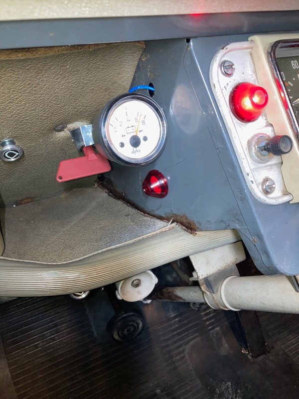Sur la deuxième sortie j'ai branché un voyant rouge sur le côté gauche du tableau de bord. Un de plus avec le voltmètre, le coupe circuit et la tirette d'amorçage de la pompe à essence !